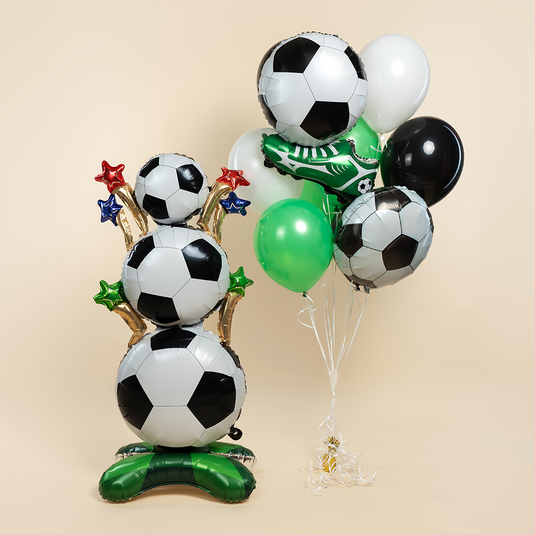 Любители спорта по достоинству оценят фольгированную фигуру гантели, волейбольного и футбольного мяча с кроссовком.