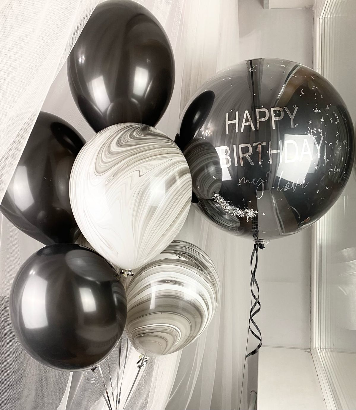 Сочетание белого и черного цветов – это вечная классика. Именно эта расцветка считается наиболее популярной, так как подходит для любого торжества. Их можно использовать не только для женских сетов шаров, но и для мужских.