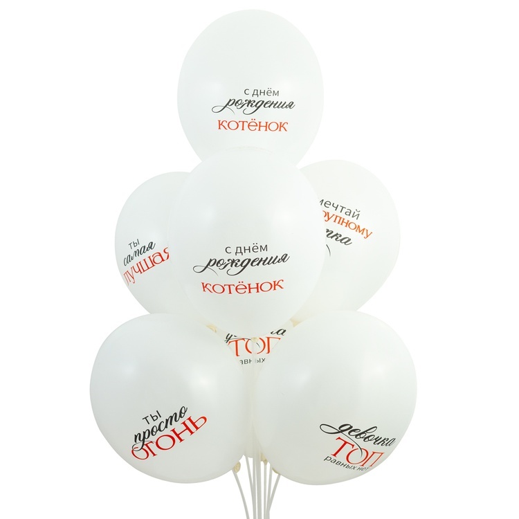 Высококачественный шар из натурального латекса. Белая пастель - матовый оттенок цвета. Шары с двусторонними, двухцветными шелкографическим текстами: Ты самая лучшая. Девочка ТОП равных нет. Ты просто огонь. С Днем рождения котенок. Мечтай по крупному детка. Идеальный ассортимент для розничной продажи воздушных шариков и украшения праздника. Воздушные шары изготавливаются из экологически безопасного 100%-ного натурального латекса. В окружающей среде разлагаются на безопасные компоненты примерно с той-же скоростью, как обычные листья деревьев. После использования лопнуть и утилизировать как бытовой отход. День Рождения